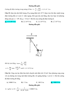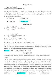 đó và cách q1 5cm; cách q2 15cm A. 4500 V/m. B. 36000 V/m. C. 18000 V/m. D. 16000 V/m. Hướng dẫn giải 9 9 q 9.10 . 5.10 1 3 E k 18.10 (V/ m) 1 2 2 r 1.0,05 1 9 9 q 9.10 . 5.10 2 3 E k 2.10 (V/ m) 2 2 2 r 1.0,15 2