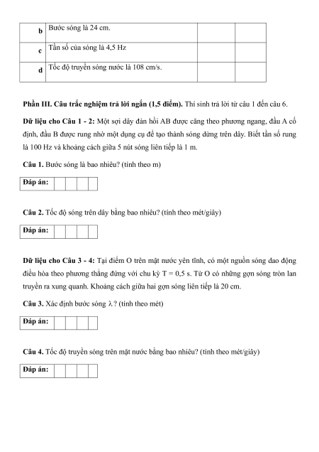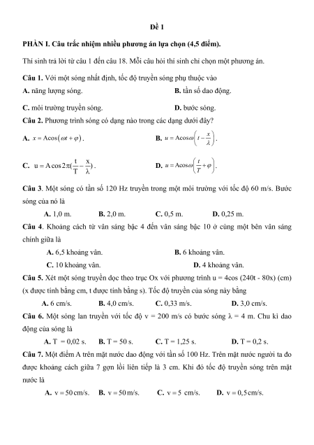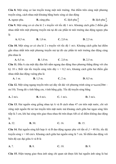 Câu 10. Một sóng cơ có chu kì 2 s truyền với tốc độ 1 m/s. Khoảng cách giữa hai điểm