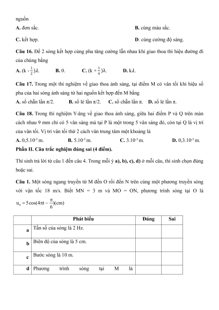 Câu 15. Hiện tượng giao thoa ánh sáng chỉ quan sát được khi hai nguồn ánh sáng là hai nguồn A. đơn sắc. B. cùng màu sắc. C. kết hợp.