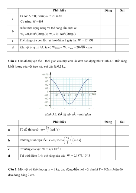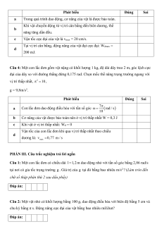 Câu 1: Biết phương trình li độ của một vật có khối lượng 0,2 kg dao động điều hòa là: x 5cos(20t)cm. Phát biểu Đúng Sai
