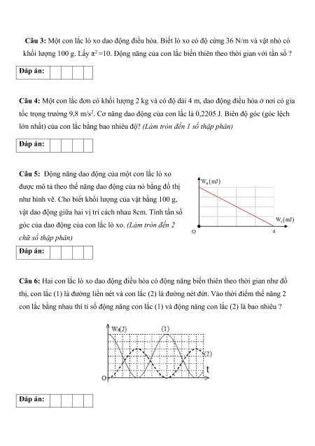 Câu 3: Một vật có khối lượng m = 1 kg, dao động điều hoà với chu kì T = 0,2π s, biên độ dao động bằng 2 cm.
