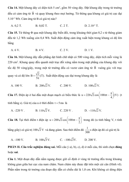 Câu 14. Một khung dây có diện tích 5 cm2, gồm 50 vòng dây. Đặt khung dây trong từ trường