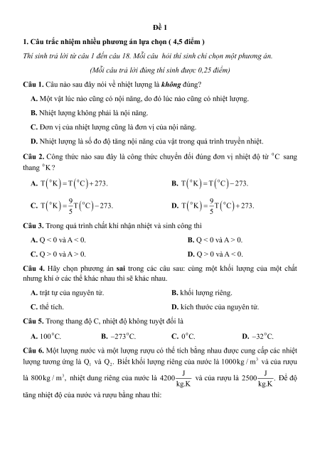 Câu 5. Trong thang độ C, nhiệt độ không tuyệt đối là A. 0 100 C. B. 0 273 C. C. 0 0 C. D. 0 32 C.