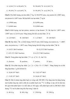 Câu 10. Hạt nhân 10Be có khối lượng 10,0135 amu. Khối lượng của neutron m 4 n = 1,0087