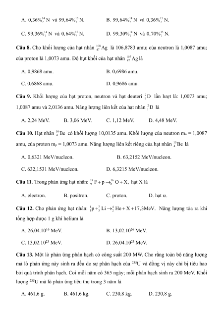 Câu 8. Cho khối lượng của hạt nhân 108Ag là 106,8783 amu; của neutron là 1,0087 amu; 47