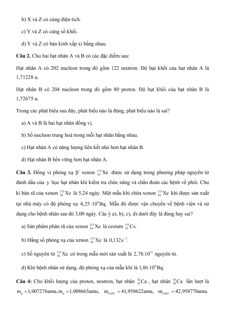 Câu 1. Cho ba hạt nhân X, Y, Z có các đặc điểm sau: