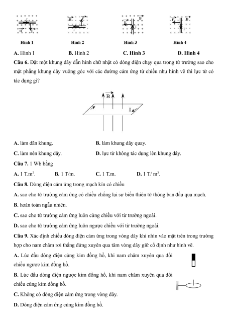 D. lực từ không tác dụng lên khung dây. Câu 7. 1 Wb bằng A. 1 T.m2. B. 1 T/m. C. 1 T.m. D. 1 T/ m2.
