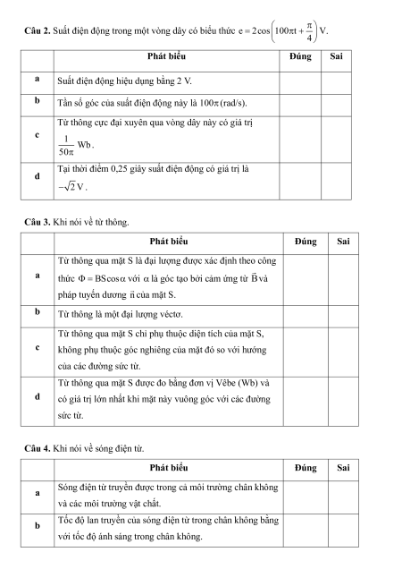 Thí sinh trả lời từ câu 1 đến câu 4. Trong mỗi ý a), b), c), d) ở mỗi câu, thí sinh chọn đúng hoặc sai.