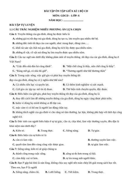 BÀI TẬP ÔN TẬP GIỮA KÌ 1 BỘ CD MÔN: GDCD – LỚP: 6