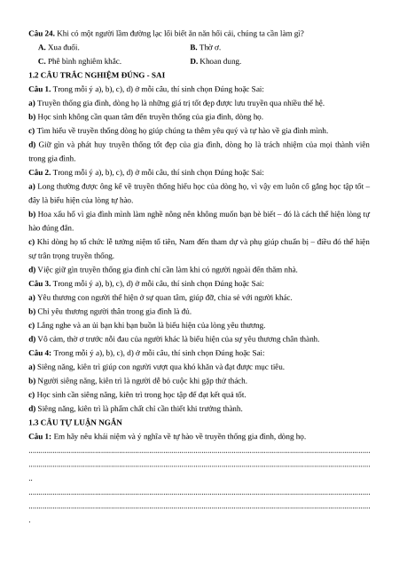 Câu 1: Truyền thống của gia đình, dòng họ được hiểu là