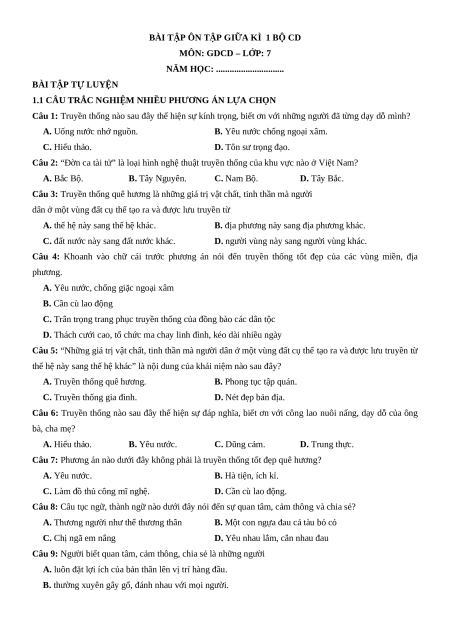 BÀI TẬP ÔN TẬP GIỮA KÌ 1 BỘ CD MÔN: GDCD – LỚP: 7
