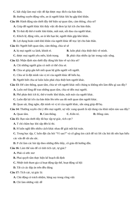 Câu 14: Thường xuyên chú ý đến mọi người, sự việc xung quanh là nội dung của khái niệm nào sau đây? A. Quan tâm. B. Cảm thông. C. Kiên trì. D. Đồng cảm.