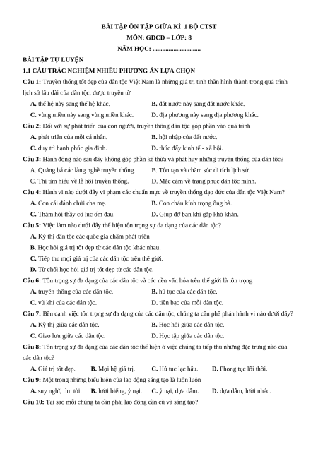 BÀI TẬP ÔN TẬP GIỮA KÌ 1 BỘ CTST MÔN: GDCD – LỚP: 8