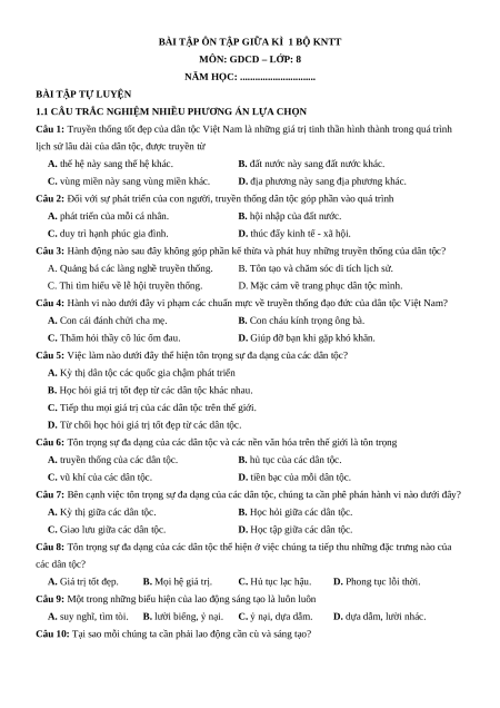 BÀI TẬP ÔN TẬP GIỮA KÌ 1 BỘ KNTT MÔN: GDCD – LỚP: 8