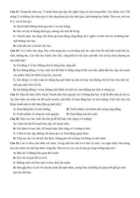Câu 16. Có ý kiến cho rằng: Học sinh trung học cơ sở đang tuổi ăn, tuổi chơi thì nên biết tranh thủ ăn,