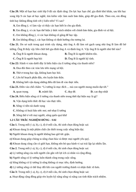 Câu 22: Hành vi nào dưới đây là biểu hiện của lí tưởng sống của thanh niên?