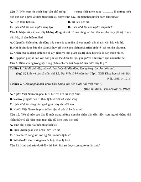 Câu 6. Trong mối quan hệ giữa sử học với công tác bảo tồn và phát huy giá trị di sản văn hóa, di sản