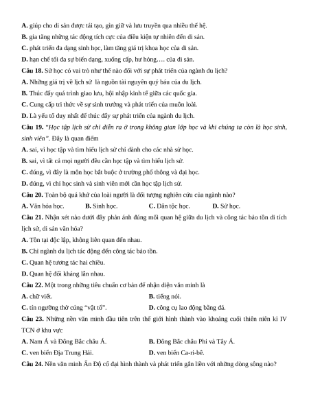 Câu 18. Sử học có vai trò như thế nào đối với sự phát triển của ngành du lịch?