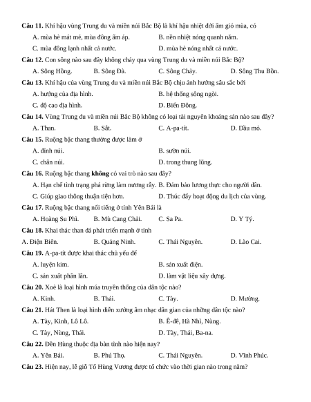 Câu 12. Con sông nào sau đây không chảy qua vùng Trung du và miền núi Bắc Bộ? A. Sông Hồng. B. Sông Đà. C. Sông Chảy. D. Sông Thu Bồn.