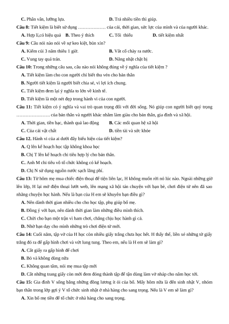 Câu 8: Tiết kiệm là biết sử dụng ……………… của cải, thời gian, sức lực của mình và của người khác.