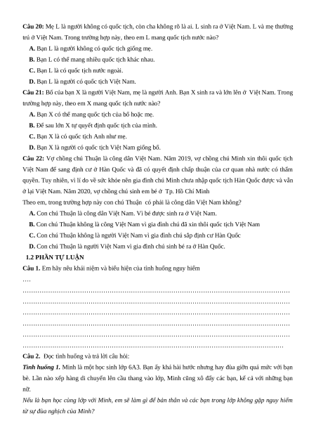 D. Con chú Thuận là người Việt Nam vì gia đình chú sinh bé ra ở Hàn Quốc. 1.2 PHẦN TỰ LUẬN