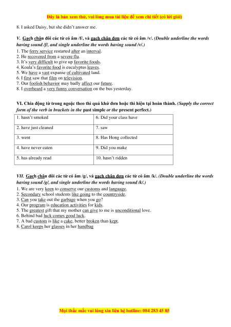 V. Gạch chân đôi các từ có âm /f/, và gạch chân đơn các từ có âm /v/. (Double underline the words