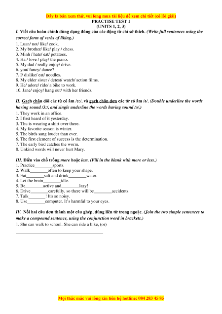 I. Viết câu hoàn chỉnh dùng dạng đúng của các động từ chỉ sở thích. (Write full sentences using the