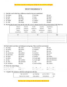 I. Find the word which has a different sound in the part underlined. 1. A. project B. leg C. evening D. neck 2. A. judo B. elbow C. nose D. blond 3. A. gets B. brings C. takes D. stops 4. A. mouth B. house C. country D. about 5. A. with B. mouth C. thanks D. three
