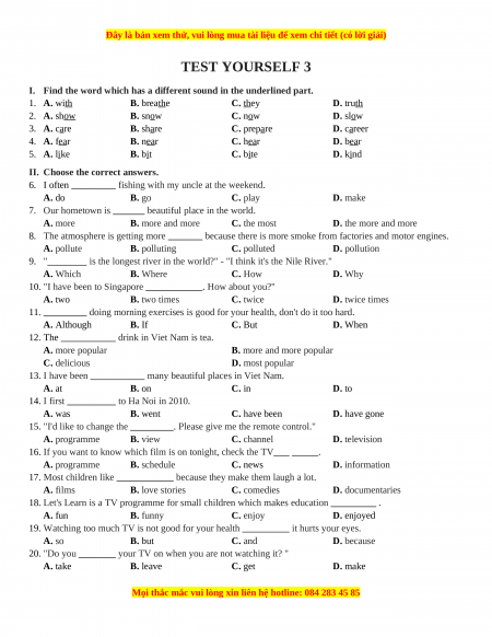 Bài tập: TEST YOURSELF 3 - Giáo viên Lưu Hoằng Trí đầy đủ đáp án