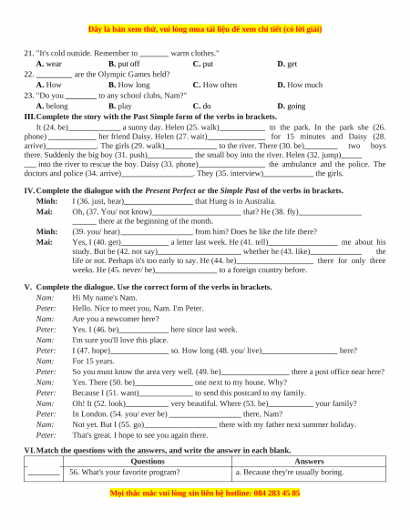IV. Complete the dialogue with the Present Perfect or the Simple Past of the verbs in brackets. Minh: I (36. just, hear) that Hung is in Australia. Mai: Oh, (37. You/ not know) that? He (38. fly)