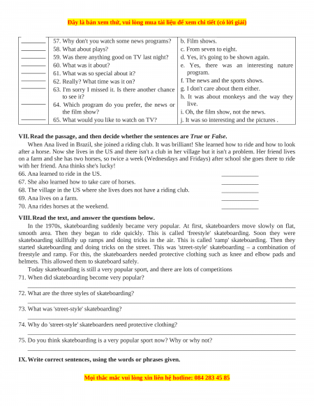 57. Why don't you watch some news programs? b. Film shows. 58. What about plays? c. From seven to eight.