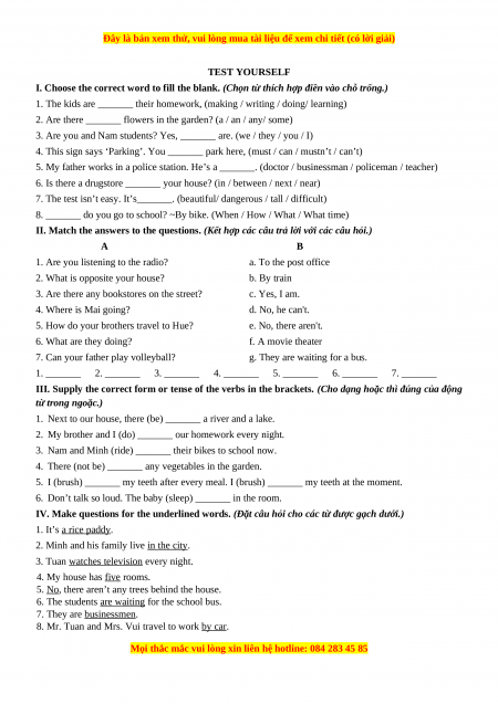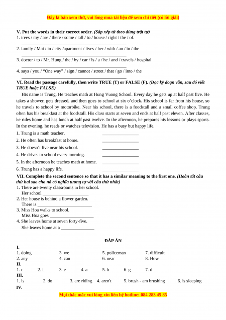 She leaves home at a ________________ ĐÁP ÁN I. 1. doing 3. we 5. policeman 7. difficult 2. any 4. can 6. near 8. How II. 1. c 2. f 3. e 4. a 5. b 6. g 7. d III. 1. is 2. do 3. are riding 4. aren't 5. brush - am brushing 6. is sleeping IV.
