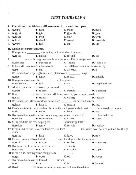 I. Find the word which has a different sound in the underlined part. 1. A. card B. hand C. band D. stand 2. A. thank B. think C. through D. then 3. A. town B. own C. cow D. town 4. A. loud B. should C. sound D. mountain 5. A. yard B. bad C. cat D. hat