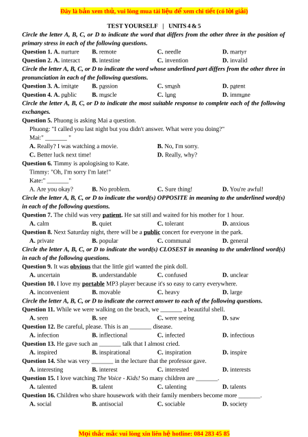Question 1. A. nurture B. remote C. needle D. martyr
