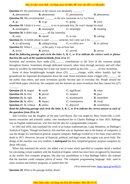 Question 17. His performance at the concert was absolutely _______ ! A. phenomenon B. phenomenal C. phenomenity D. phenomena