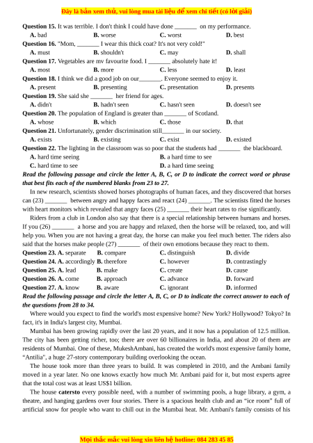 Question 17. Vegetables are mv favourite food. I _______ absolutely hate it! A. most B. more C. less D. least