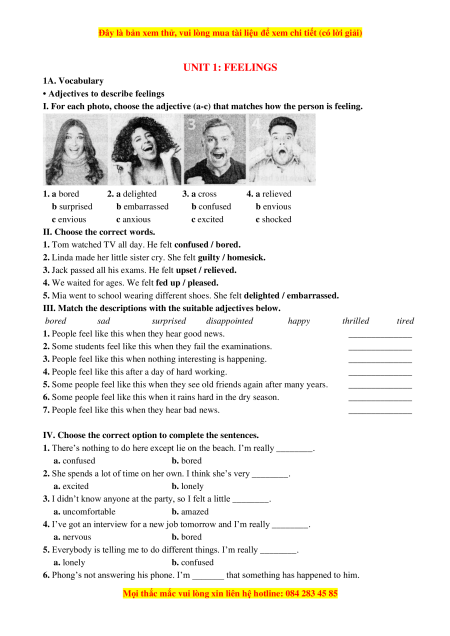 I. For each photo, choose the adjective (a-c) that matches how the person is feeling. 1. a bored 2. a delighted 3. a cross 4. a relieved b surprised b embarrassed b confused b envious c envious c anxious c excited c shocked