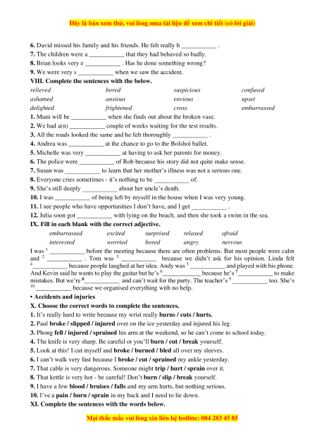 VIII. Complete the sentences with the below. relieved bored suspicious confused ashamed anxious envious upset delighted frightened cross embarrassed