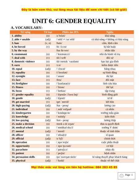 UNIT 6: GENDER EQUALITY A. VOCABULARY: Từ vựng Từ loại Phiên âm IPA Nghĩa 1. ability (n) /əˈbɪləti/ khả năng 2. able ≠ unable (adj) /ˈeɪbl/ ≠ /ʌnˈeɪbl/