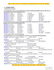 Question 6: A. equality B. parachute C. violence D. secretary Question 7: A. engineer B. exercise C. negative D. medical D. organize II-VOCABULARY AND GRAMMAR: