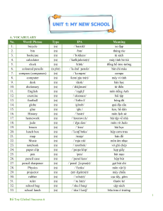 A. VOCABULARY No. Word/ Phrase Type IPA Meaning 1. bicycle (n) /ˈbaɪsɪkl/ xe đạp 2. bin (n) /bɪn/ thùng rác 3. bookcase (n) /ˈbʊkkeɪs/ tủ sách 4. calculator (n) /ˈkælkjuleɪtə(r)/ máy tính bỏ túi 5. clock (n) /klɒk/ đồng hồ treo tường 6. coloured pencils (n phr) /ˈkʌləd ˈpenslz/ bút chì màu 7. compass (compasses) (n) /ˈkʌmpəs/ compa 8. computer (n) /kəmˈpjuːtə(r)/ máy vi tính 9. desk (n) /desk/ bàn học 10. dictionary (n) /ˈdɪkʃənəri/ từ điển 11. English (n) /ˈɪŋɡlɪʃ/ môn tiếng Anh 12. exercise (n) /ˈeksəsaɪz/ bài tập 13. football (n) /ˈfʊtbɔːl/ bóng đá 14. globe (n) /ɡləʊb/ quả địa cầu 15. glue (n) /ɡluː/ keo, hồ dán 16. History (n) /ˈhɪstri/ môn lịch sử 17. homework (n) /ˈhəʊmwɜːk/ bài tập về nhà 18. judo (n) /ˈdʒuːdəʊ/ môn võ Judo 19. lesson (n) /ˈlesn/ bài học 20. lunch box (n) /ˈlʌntʃ bɒks/ hộp cơm trưa 21. map (n) /mæp/ bản đồ 22. Music (n) /ˈmjuːzɪk/ môn âm nhạc 23. notebook (n) /ˈnəʊtbʊk/ vở ghi chép 24. paper clip (n) /ˈpeɪpə klɪp/ kẹp giấy 25. pen (n) /pen/ bút mực 26. pencil case (n) /ˈpensl keɪs/ hộp bút 27. pencil sharpener (n) /ˈpensl ˈʃɑːpnə(r)/ gọt bút chì 28. Physics (n) /ˈfɪzɪks/ môn vật lý 29. projector (n) /prəˈdʒektə(r)/ máy chiếu 30. rubber (n) /ˈrʌbə(r)/ cục tẩy, gôm 31. ruler (n) /ˈruːlə(r)/ thước kẻ 32. school bag (n) /ˈskuːl bæɡ/ cặp sách 33. school lunch (n) /ˈskuːl lʌntʃ/ bữa trưa ở trường 1