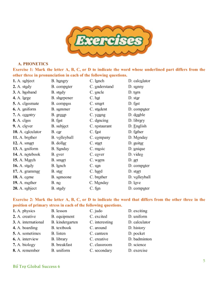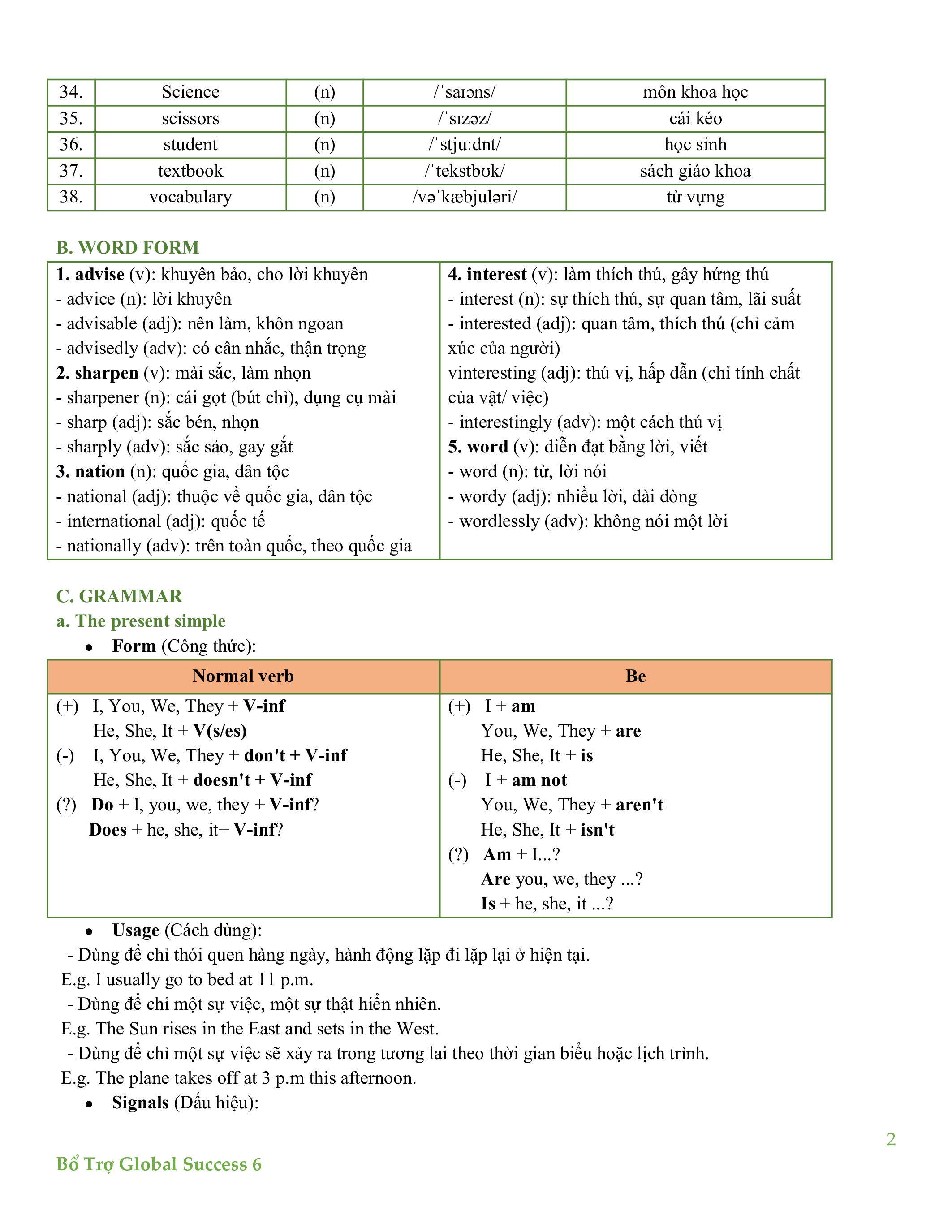 Bổ Trợ Global Success 6 34. Science (n) /ˈsaɪəns/ môn khoa học 35. scissors (n) /ˈsɪzəz/ cái kéo 36. student (n) /ˈstjuːdnt/ học sinh 37. textbook (n) /ˈtekstbʊk/ sách giáo khoa 38. vocabulary (n) /vəˈkæbjuləri/ từ vựng B. WORD FORM