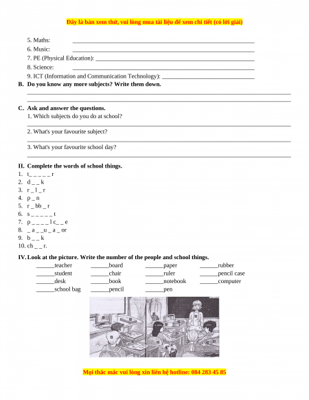 IV. Look at the picture. Write the number of the people and school things. _______teacher _______board _______paper _______rubber _______student _______chair _______ruler _______pencil case _______desk _______book _______notebook _______computer _______school bag _______pencil _______pen