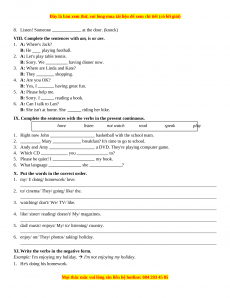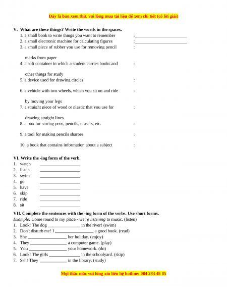 VI. Write the -ing form of the verb. 1. watch ___________________ 2. listen ___________________ 3. swim ___________________ 4. go ___________________ 5. have ___________________ 6. skip ___________________ 7. ride ___________________ 8. sit ___________________