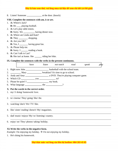 IX. Complete the sentences with the verbs in the present continuous. have listen not watch read speak play 1. Right now John
