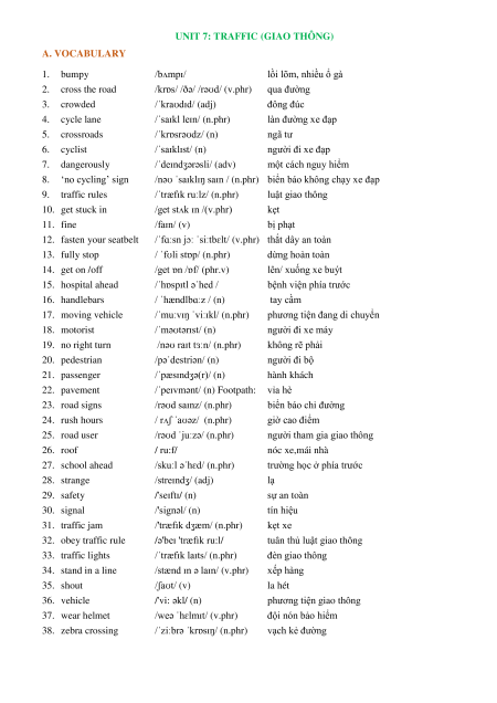 UNIT 7: TRAFFIC (GIAO THÔNG) A. VOCABULARY 1. bumpy /bʌmpɪ/ lồi lõm, nhiều ổ gà 2. cross the road