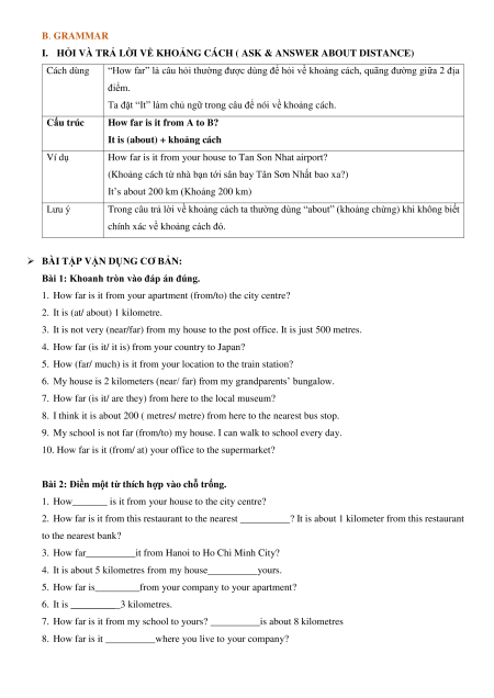 I. HỎI VÀ TRẢ LỜI VỀ KHOẢNG CÁCH ( ASK & ANSWER ABOUT DISTANCE) Cách dùng