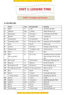 PART 1: Vocabulary and Grammar A. VOCABULARY Word Type Pronunciation Meaning 1. adore (v) /əˈdɔː/ yêu thích, mê thích 2. addicted (adj) /əˈdɪktɪd/ nghiện (thích) cái gì 3. beach game (n) /biːtʃ ɡeɪm /