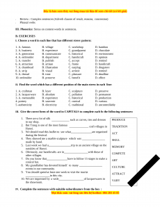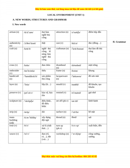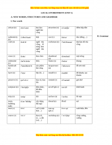 A. NEW WORDS, STRUCTURES AND GRAMMAR I. New words artisan (n) /ɑːtɪˈzæn/ thợ làm attraction (n) /əˈtrækʃn/ điểm hấp dẫn nghề thủ công II. Grammar authenticity /ɔːθenˈtɪsəti/ thật cast (v) /kɑːst/ đúc (đồng…) (n) craft (n) /krɑːft/ nghề thủ craftsman (n) /ˈkrɑːftsmən/ thợ làm đồ thủ công, kĩ công năng làm nghề thủ công cross (v) /krɒs/ đan chéo drumhead /drʌmhed/ mặt trống (n) embroider /ɪmˈbrɔɪdə/ thêu frame (n) /freɪm/ khung (v) handicraft /ˈhændɪkrɑːft/ sản phẩm lacquerware /ˈlækəweə/ đồ sơn mài (n) thủ công (n) layer (n) /ˈleɪə/ lớp (lá…) mould (v) /məʊld/ đổ khuôn, tạo khuôn preserve (v) /prɪˈzɜːv/ bảo vệ, bảo remind (v) /rɪˈmaɪnd/ gợi nhớ tồn sculpture (n) /ˈskʌlptʃə/ điêu khắc, set off (ph.v) /set ɒf/ khởi hành đồ điêu khắc strip (n) /strɪp/ dải surface (n) /ˈsɜːfɪs/ bề mặt team- /tiːm-ˈbɪldɪŋ/ xây dựng thread (n) /θred/ sợi building đội ngũ (adj) treat (v) /triːt/ xử lí (chất turn up /tɜːn ʌp/ xuất hiện, đến thải…) (ph.v) weave (v) /wiːv/ đan (rổ, workshop (n) /ˈwɜːkʃɒp/ công xưởng, rá…), dệt xưởng (vải…)