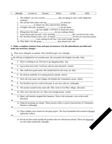 V. Make a comploex sentence from each pair of sentences. Use the subordinator provided and